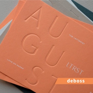 Emboss dan deboss adalah teknik finishing yang memberikan kesan timbul/tenggelam di area tertentu. Emboss membuat area kertas terlihat timbul ke arah atas sedangkan deboss membuat area kertas terlihat tenggelam ke arah bawah.
