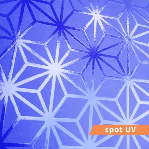 Spot UV adalah proses memberikan efek glossy atau mengkilap dengan menggunakan cairan di area spesifik pada media kertas cetak seperti logo, tulisan, ataupun gambar. Finishing spot UV biasanya diaplikasikan bersama dengan laminasi doff sehingga area spot UV tampak lebih jelas.